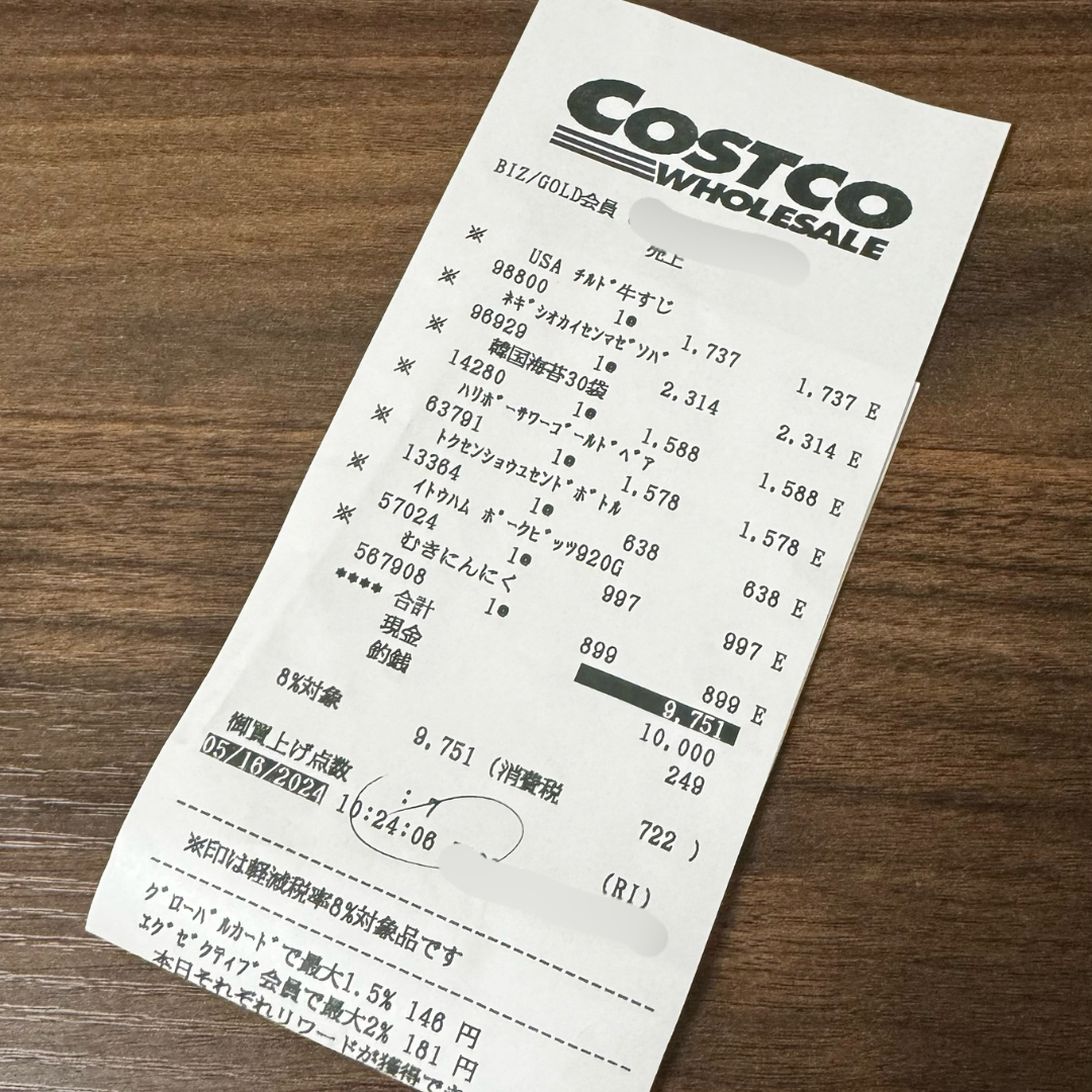 コストコで買ったもの公開【レシートあり】2024.05.16 2024/05/17 こんにちは。年間150日コストコに通う主婦まゆてぃです!2024.05.16コストコでお買い物してきたもの紹介!※税込価格を掲載しています🌟USAチルド牛すじ#98800 100gあたり79円🌟葱塩海鮮塩焼きそば#96929 100gあたり192円🌟両班韓国海苔#14280 30袋 1588円🌟ハリボーサワーゴールドベアー#63791 870g 1578円🌟むきにんにく#567908 453.59g 899円🌟ヤマサ特選醤油#13364 2本 638円🌟ポークビッツ#57024 920g SALE 1498円→997円合計金額は9,751円でした!インスタの動画を見る→★このブログの更新をアプリでお知らせできます!ぜひ登録して見にきて下さいね♡Xでも更新をお知らせしてます!フォローしてね♡楽天ROOM公式インフルエンサーです♡お得・オススメ集めてるROOMはこちら→★ 「COSTCO」カテゴリの最新記事 タグ :#costco#コストコ#コストコおすすめ#コストコ購入品 < 前の記事次の記事 > コメント このブログにコメントするにはログインが必要です。 さんログアウト この記事には許可ユーザしかコメントができません。 コメントフォーム 名前 コメント 記事の評価 リセット リセット 顔 星 情報を記憶 コメントを投稿する
